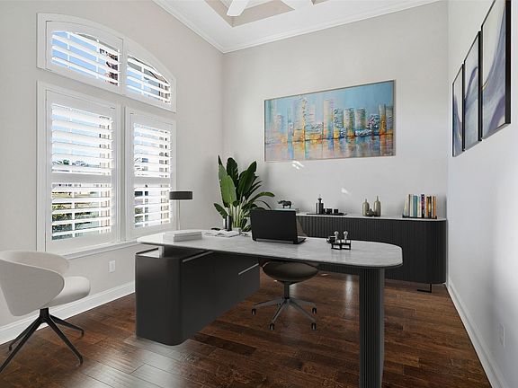 This home features many upgrades, including paver driveway, plantation shutters, Roman shade window treatments, 8-foot doors, a den/flex room with French doors, a formal dining room with a double tray ceiling, and gleaming hardwood floors throughout the home.