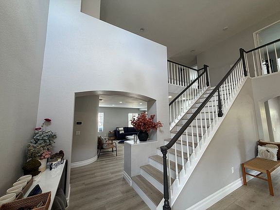 Welcome to this bright and spacious 5-bedroom, 3-bathroom home in the highly desirable East Highlands Ranch community! Located on a quiet cul de sac and with 2,633 sq. ft. of living space on a generous 8,637 sq. ft. lot, this property offers the perfect blend of comfort, elegance, and natural beauty. Enjoy updated modern flooring throughout, a formal living room with high ceilings that flow nicely into the formal dining room, both with updated lighting. The family room includes wet bar, fireplace and tv mount. The kitchen has ample cabinet and counter space, a large island with stove top and additional storage options. Laundry room with hookups located just off of the finished 2 car garage. One bedroom is located downstairs just off of the newly updated full bathroom and offers large closet space and large windows for a bright and open space. Upstairs you'll find a large loft space along with 3 additional guestrooms, all with ample closet space. The upstairs bathroom, also fully updated features double vanities, new lighting and beautiful tub/shower. The master suite is spacious and bright with high ceilings and has both a walk in closet and additional in room closet. It flows nicely into the fully upgraded master bath which includes; gorgeous soaking tub, newly updated double vanity, new lighting, walk in shower with shower head and faucet for easy washing. The exterior of the home has been fully landscaped and features an abundance of different flowers, foliage for privacy as well as a citrus tree and persimmon tree. This home is also located next to a paved walking trail that is open to EHR residents. You will also be able to enjoy all of the East Highlands Ranch amenities which include access to; additional walking trails, pools, spas, playgrounds, tennis and pickleball courts, catch and release lake, track, picnic areas, basketball courts, soccer fields and community orchard with free seasonal fruits.