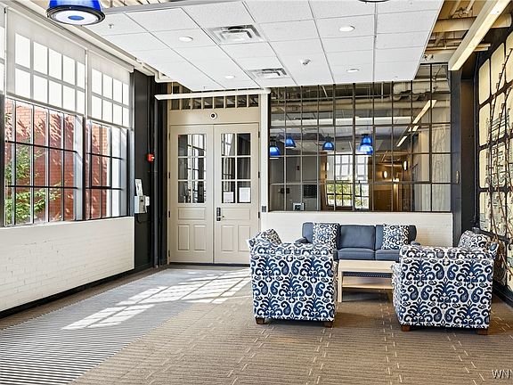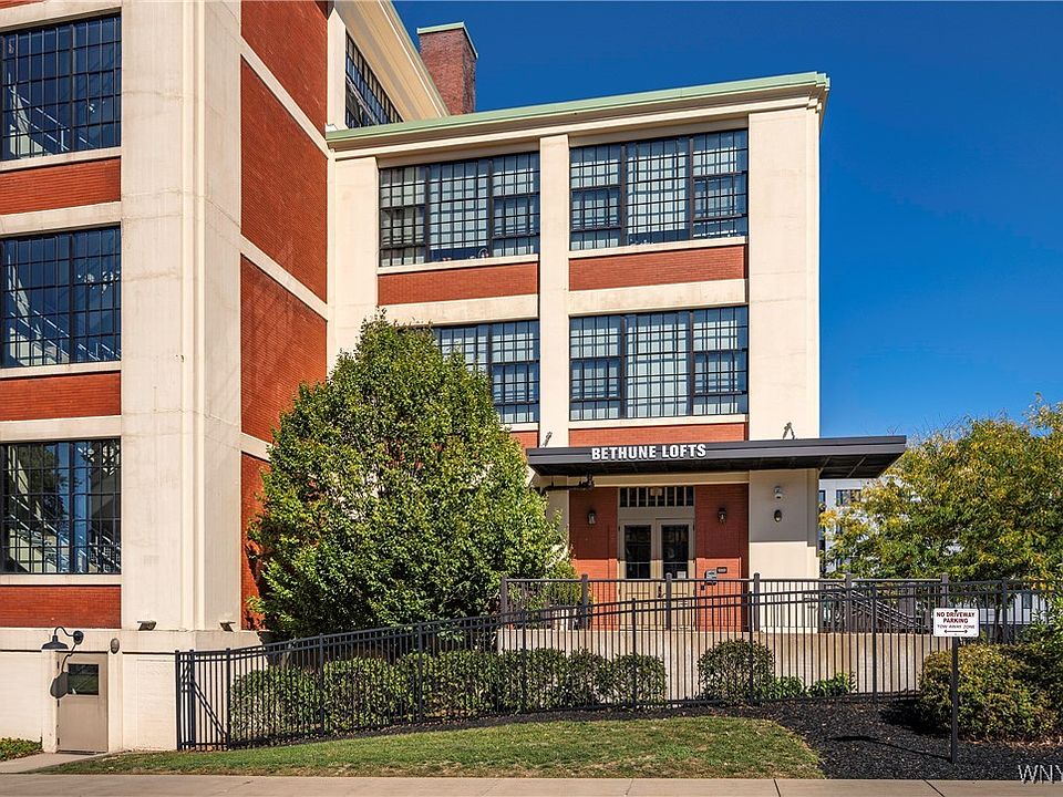 Stunning 1 bed, 1 bath corner unit at the historic Bethune Lofts. Formerly the home of the Buffalo Meter Company, Bethune Lofts features 87 condo units located just steps from Hertel Avenue & University at Buffalo, South Campus. This bright & spacious end unit boasts soaring ceilings, southern & western exposure for incredible light & sunsets, & an ideal unit location w/ no direct neighbors above. This fabulous open-concept living space features an updated kitchen w/ granite counters, stainless steel appliances, sleek dark wood cabinetry & generous storage. The large Living/Dining area offers newer luxury vinyl flooring, fabulous oversized windows, & wonderful neighborhood views. The primary bedroom features a closet w/ organizers, plush wall/wall carpeting & an overhead ceiling fan. The large full bathroom boasts tile flooring, generous storage, & a large walk-in shower. Additional unit highlights include: Central Air, Pets allowed, Open Parking available, & Heat included in your HOA. The Bethune lofts offers incredible amenities & carefree living by providing an on-site fitness center, secure bike storage, laundry facilities, stylish common areas, secured entry & gated parking. On-site storage space available for an additional fee. The Bethune Lofts offers quick access to all of Hertel Avenue's amenities, the Buffalo Niagara Medical Campus, UB South Campus & McCarthy Park. This building also allows 12 month rentals. Whether you’re building your career, building your portfolio, or just craving the city lifestyle, the Bethune Lofts delivers modern style, everyday convenience, low-maintenance, and historic charm. Come see for yourself!