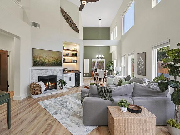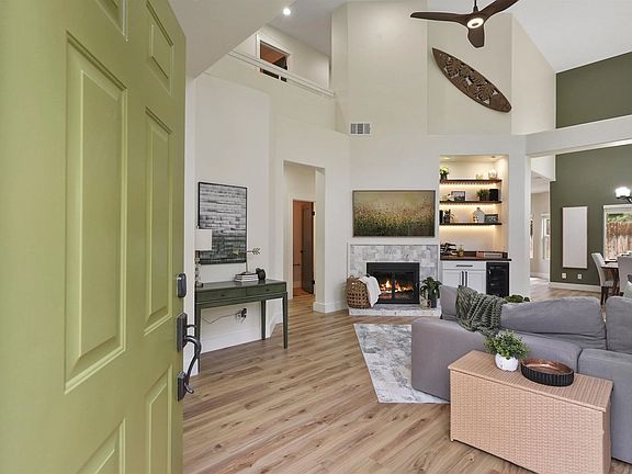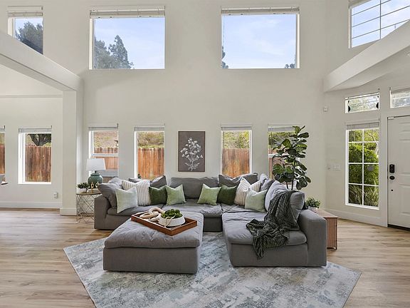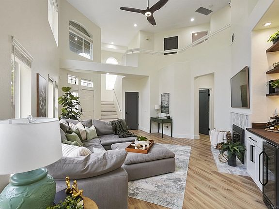 Welcome to this beautiful detached home in the highly sought-after Regency community of La Costa. Nestled on a quiet cul-de-sac next to the Tot Lot, this light-filled residence offers privacy, sophistication, and a seamless layout with an expansive first-floor primary bedroom and owned solar. Impressive two-story ceilings, gorgeous new LVP flooring, and high-placed windows with motorized shades enhance the open-concept living and dining areas, complemented by an updated fireplace and a stylish dry bar with a beverage fridge. The home has been thoughtfully upgraded with new solid core wood doors, casing, and baseboards, new recessed lighting, and an upgraded electrical panel. The main-level primary suite boasts tray ceilings, sliding glass doors to the private backyard, and a spa-like, recently renovated ensuite featuring dual sinks, a soaking tub, a walk-in shower, and a custom closet system. The updated eat-in kitchen includes Granite countertops, a gas cooktop, and a cozy breakfast nook with backyard access. Upstairs, three spacious bedrooms share a full bath with dual sinks. Additional highlights include a whole house fan, a full-sized laundry room with a washer and dryer, a whole-house water filtration system and softener, and a tankless water heater. The private backyard offers lush grass and an inviting open patio, perfect for year-round enjoyment. With low HOA dues and no Mello-Roos, this home is ideally located just minutes from La Costa Meadows Elementary, shopping plazas, Alga Norte Park, and stunning beaches.