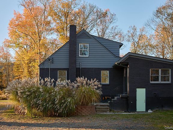 Set under the gaze of Millbrook Mountain, an iconic cliff face of the Shawangunk ridge, this freshly renovated 1951 brick cape sits back from the road on 2.7 acres of land, with the Marakill stream running along the rear property line. New picture windows take in the views from the front of the home, overlooking the long half-circle driveway and the ridge beyond. Deep hued mineral masonry paint has made the brick exterior like new, while selective tree work and landscaping has enhanced views and provided privacy. Indoors you find refinished wood floors, fully renovated bathrooms with modern styling, and a renovated kitchen with premium cabinets and drawers, butcher block countertops and open shelving. The mid-century aesthetic is playful and welcoming in common areas, and peaceful and toned down in the bedrooms. The layout is ideal, with a first floor bedroom, office, and full bathroom with tub and laundry nook, all tucked away off a hall that opens to the living and dining areas. Off the dining room, the sunny kitchen has its own entrance from the driveway and a private patio. Upstairs there are two nicely sized bedrooms and a shared full bathroom with walk-in shower. For comfort and efficiency the home has been outfitted with mini splits for A/C and insulated with open cell spray foam. Other updates include new electric service, whole house water filter, and new interior and exterior lighting. The backyard is level and perfect for games, gardens, etc, and a mowed path leads down to the stream that runs between the property and the neighboring farm fields, a peaceful place to sit and dream. This home is located a stone's throw from world-class climbing and hiking at Mohonk Preserve and Minnewaska State Park, and the Gardiner community's generous offerings of yoga, farm stand produce, locally baked bread, and artisanal wine and spirits are at your fingertips. Call to book a showing today!