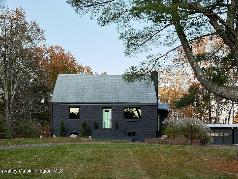 Set under the gaze of Millbrook Mountain, an iconic cliff face of the Shawangunk ridge, this freshly renovated 1951 brick cape sits back from the road on 2.7 acres of land, with the Marakill stream running along the rear property line. New picture windows take in the views from the front of the home, overlooking the long half-circle driveway and the ridge beyond. Deep hued mineral masonry paint has made the brick exterior like new, while selective tree work and landscaping has enhanced views and provided privacy. Indoors you find refinished wood floors, fully renovated bathrooms with modern styling, and a renovated kitchen with premium cabinets and drawers, butcher block countertops and open shelving. The mid-century aesthetic is playful and welcoming in common areas, and peaceful and toned down in the bedrooms. The layout is ideal, with a first floor bedroom, office, and full bathroom with tub and laundry nook, all tucked away off a hall that opens to the living and dining areas. Off the dining room, the sunny kitchen has its own entrance from the driveway and a private patio. Upstairs there are two nicely sized bedrooms and a shared full bathroom with walk-in shower. For comfort and efficiency the home has been outfitted with mini splits for A/C and insulated with open cell spray foam. Other updates include new electric service, whole house water filter, and new interior and exterior lighting. The backyard is level and perfect for games, gardens, etc, and a mowed path leads down to the stream that runs between the property and the neighboring farm fields, a peaceful place to sit and dream. This home is located a stone's throw from world-class climbing and hiking at Mohonk Preserve and Minnewaska State Park, and the Gardiner community's generous offerings of yoga, farm stand produce, locally baked bread, and artisanal wine and spirits are at your fingertips. Call to book a showing today!