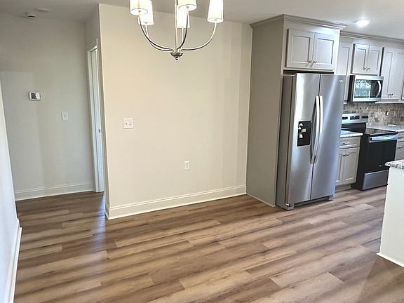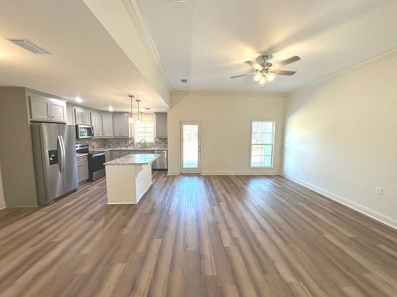 Step inside to be greeted by an open and airy floor plan that enhances the flow of the home. The living room is adorned with sleek LVP flooring and a ceiling fan, creating a welcoming space for relaxation or entertaining. Adjacent, the modern kitchen is a standout with granite countertops, a tiled backsplash, and an oversized island that invites casual dining or meal prep. Stainless steel appliances, including a dishwasher, stove, refrigerator, and microwave, complement the plentiful cabinetry and expansive counter space, making this kitchen a dream for both everyday cooking and hosting.