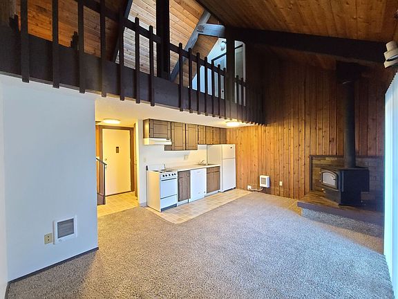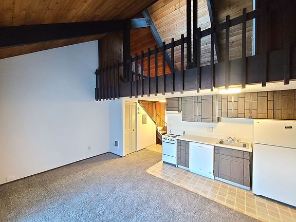 This gorgeous loft style 1 Bed / 1 Bath unit is located on the Spokane river and comes with beautiful features. A big living room area features a big window with a sliding door that leads to a private patio and produces lot's of natural light. The kitchen is equipped with a range of appliances such as refrigerator, dishwasher, stove and spacious wooden cabinets with plenty of counter top space. Unit is accented out with dark wooden beams that gives the unit a rustic feel. The bedroom is located upstairs and includes a spacious closet. The bathroom has a dark wooden vanity with extra storage below.