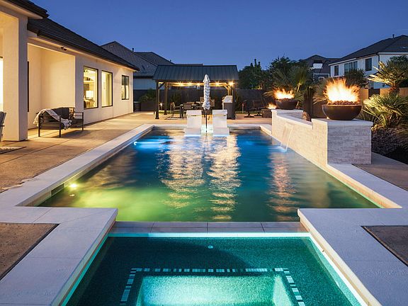 A stunning luxurious single-story home with an unparalleled backyard paradise. Located in the highly sought-after Arbors neighborhood. This home has been maintained with immaculate care. Stainless steel appliances with a professional Frigidaire counter depth refrigerator/freezer, double ovens with built in air fryer, quartz countertops, farmhouse sink, gas range, and custom cabinets make this kitchen elite. Barn door separating kitchen from second family room, hardwood floors, upgraded carpet and padding, plantation shutters and electric blinds allow coziness and warmth with plenty of natural light. Primary bath offers a haven for retreat with a large double headed walk in shower, separate tub built for relaxing and a master closet that has plenty of storage for two. A large inviting front porch with ring doorbell, concrete curbing and manicured front yard shows pride of ownership. A large 3 car garage with epoxy floors, recirculating instant hot water pump, soft water tank, and two A/C units with three thermostats make daily life a breeze. The backyard is a dream for entertaining and relaxing with an award-winning Premier Sport Pool with Spa, that has a lifetime warranty. The pool has advanced plumbing making it more cost effective, with smart pool technology and infrared cleaning system which reduces water bills and chemical purchases (like a reverse osmosis). The pool offers built in fire bowls, a waterfall, lights, bubblers and lounge ledgers with chaise shades which are all controlled through an app. The outdoor retreat offers a gazebo with string lights, built-in BBQ with plumbed natural gas, the kitchenette has enough storage and counter space to host as many as needed. A putting green for some "at home practice," a large custom natural gas fire pit with a Basalt Slab that offers a fun peaceful night around a fire, and an attached side shed for yard tools with raised flower beds making for easy gardening. The backyard has been professionally landscaped and meticulously maintained and is a paradise at night with automatic lights and timers. The home also has permanent Trim Lights with a lifetime warranty, custom colors and patterns controlled by an intuitive app making yearly Christmas lights a thing of the past. A large cement pad on the side of the house caps off this luxurious, special, one of a kind home. Square footage figures are provided as a courtesy estimate only. Buyer is advised to obtain an independent measurement.
