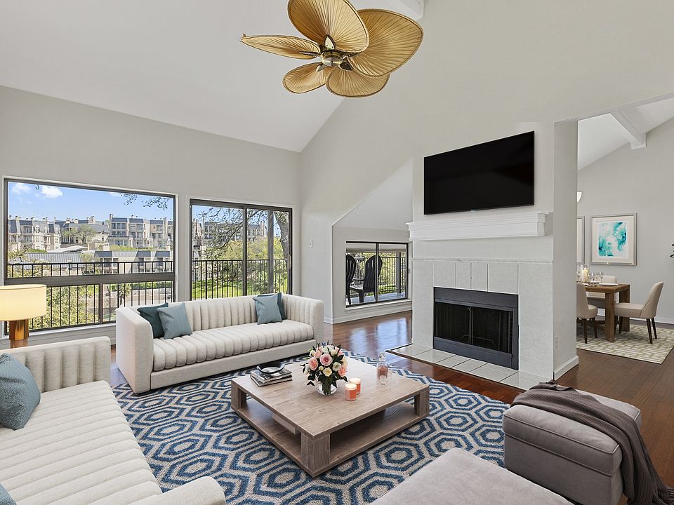 Enjoy lake living at this waterfront condo community. This elegant lock-and-leave has been recently updated. Move-in ready. Dramatic open floor plan with vaulted ceilings, wood floors, fireplace, wet bar and stunning lake views. Granite counters and wine fridge in kitchen. Amazing lake views from upper and lower decks. Lots of amenities. Walk a few steps from covered parking to first floor entrance, tennis courts and meditation garden. Lake access from two-story boat dock. Large state-of-the-art gym. Two Pools. Secluded lounging areas overlooking lake. Key fob allows entrance to Lucy's Fried Chicken with outdoor lake-view dining. Dog-friendly. Two newer HVAC units. HOA includes cable TV, internet, water, sewer, trash, gated access and on-site manager. Close to new medical center, shopping and dining.
