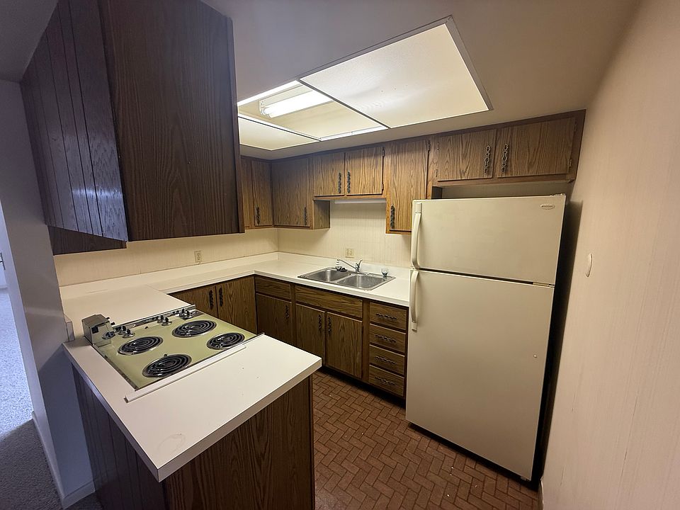 1 bedroom, 1 bathroom upstairs apartment unit with range, refrigerator, W/D hookup, off-street parking, vinyl flooring, and balcony/deck.