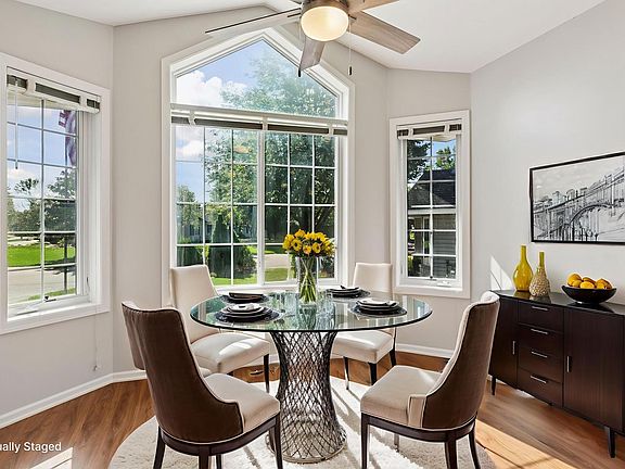 Welcome home to easy main level living with thoughtfully designed spaces inside and out. The large entry foyer flows into a sunny kitchen with stainless appliances and a bay-window dining nook and an open living and dining area anchored by a cozy gas fireplace with a TV mount designed for eye-level viewing. Motorized window blinds add comfort and convenience, while the bright sunroom invites you to relax or step onto the deck overlooking the backyard with a dog run. Four spacious bedrooms offer flexibility for family, guests, or a home office, and the partially finished lower level provides endless potential for a rec room, gym, or workshop, while still leaving room for storage. A front patio creates a welcoming spot to connect with neighbors, and the attached garage keeps daily life simple. With no association fees, this twin home blends freedom, comfort, and space to make it truly your own.