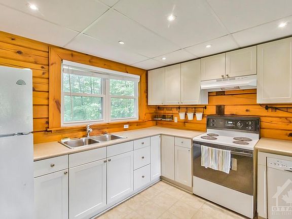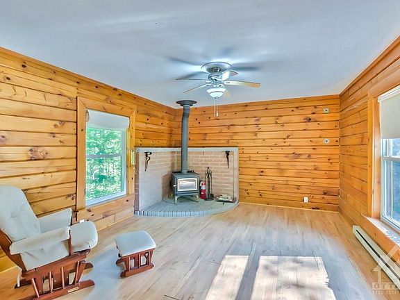 Tucked away on 1.6 treed acres, charming log home and large garage-workshop. Lots of open living spaces, starting with full front verandah. Inside, lovely exposed logs and beams. Living room with cozy woodstove. Well-planned kitchen has defined food-prep spaces - yet open to dining area and its propane free-standing stove. The three-season sunroom has soft calming affect. Main floor bedroom (or office) with walk-in closet. Combined laundry-powder room. Mudroom for coats, hats and boots. Upstairs, your bedroom has big bright dormers and wall of his&her closets. Second (or third) bedroom and full bathroom with granite vanity. The detached 19'x14' garage has insulated double doors, hydro, workbench, windows and exterior lean-to for wood storage. Included is 20'x12' coverall, garden shed, raised vegetable beds and portable air conditioner. Hi-speed. Great location near White Lake for fishing and swimming. And, down the road, is Pakenham's golf course and family ski hill. 40 mins to Ottawa.