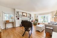 Expansive bow windowExpansive bay windowClassic rochester hardwood floorsRustic stone accentsModern open shelvingSpacious bedroomsScenic backyard views