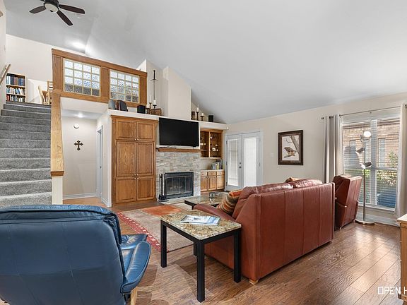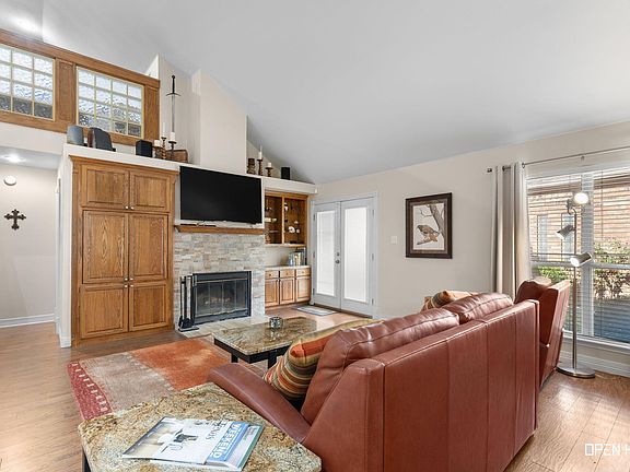 Fantastic Zero Lot with 2089 sq ft 2/2/2 (upstairs could be 3rd bedroom or second living area, office)Open floorplan offers laminate wood, nice tall ceilings, wood burning fireplace, Custom built cabinetries, Granite countertops, black appliances great space for entertaining! Isolated master, large mst bathroom with walk-in shower, ceramic tile, dbl sinks. Wall mounted TV in living room stays with home. Formal dining room! Courtyard area has covered patio, storage buildings, pretty landscaping front & back!