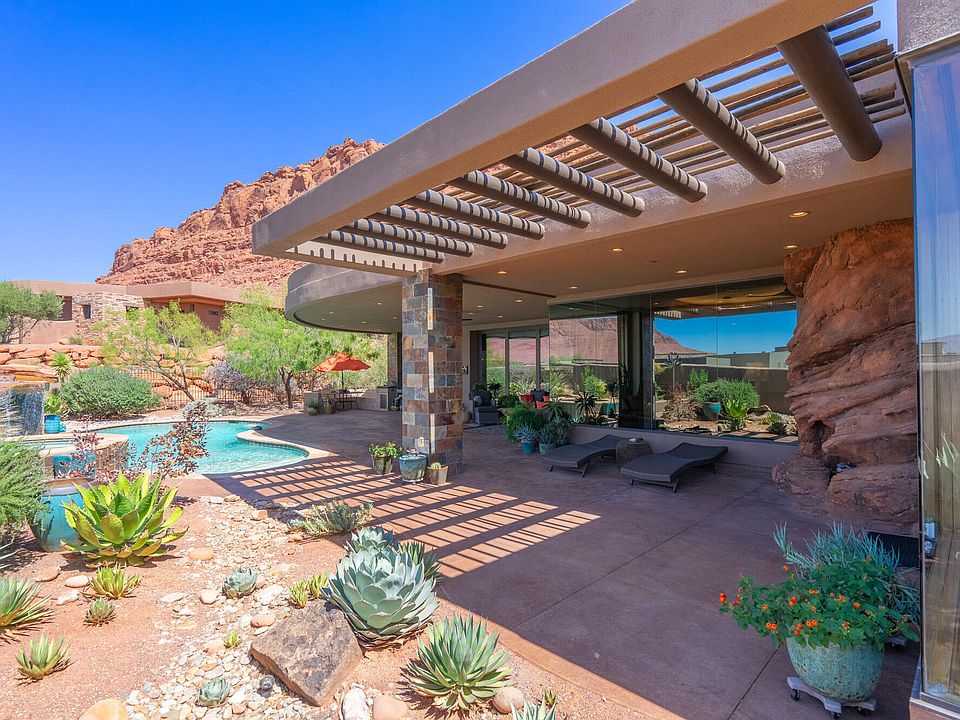 Experience luxury living in this beautiful single-level custom home in Kachina Cliffs at Entrada. The home is situated on a large estate lot with stunning views to enjoy any time of the day or night. Packed with amazing features and upgrades like multiple fireplaces with faux stone, a chef's kitchen, artistic glass windows - the list goes on and on! Unique to this home is a very large covered patio, which provides a perfect spot to watch the changing shadows on Red Mountain, Snow Canyon, Johnson Arch, and the Scout Caves. Spacious master suite with relaxing bath. There's also a cozy casita and a stunning pool with a grotto waterfall, spa, fire pit, BBQ, and a built in dinning area on the back patio - all accessible through large sliding glass doors. Truly a masterpiece you don't want to miss! Office comes with 2 full size wine coolers that hold 300 bottles in each - WOW impressive! The garage is spacious enough for three cars or golf cart, and other toys or create an art studio! Owner's landscaping was showcased in the 2024 Parade of Gardens Southern Utah!!