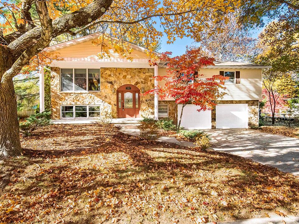 Welcome to this inviting 4-bedroom, 2.5-bath bi-level home in desirable Blue Ridge on Bloomington’s north side. Situated on a .55-acre lot surrounded by mature trees and a flat, usable yard, this property offers space, comfort, and endless potential to make it your own. Step inside to discover fresh paint and new flooring on the upper level, a formal dining room, and a bright vaulted sunroom that opens to the deck overlooking the private backyard. Kitchen updates include new stainless steel appliances, generous counter space, and ample cabinetry for storage. The lower level provides a cozy family room with a masonry fireplace, built-in bookshelves, 4th bedroom, and a den or home office. Enjoy unique artistic murals and architectural details throughout, although they are easy to change. The roof and HVAC system are each under 5 years old, offering peace of mind for years to come. With excellent storage, multiple gathering spaces, and a sought-after northside location. Convenient to schools, shopping, parks, trails, Griffy Lake, Indiana University, and I-69.