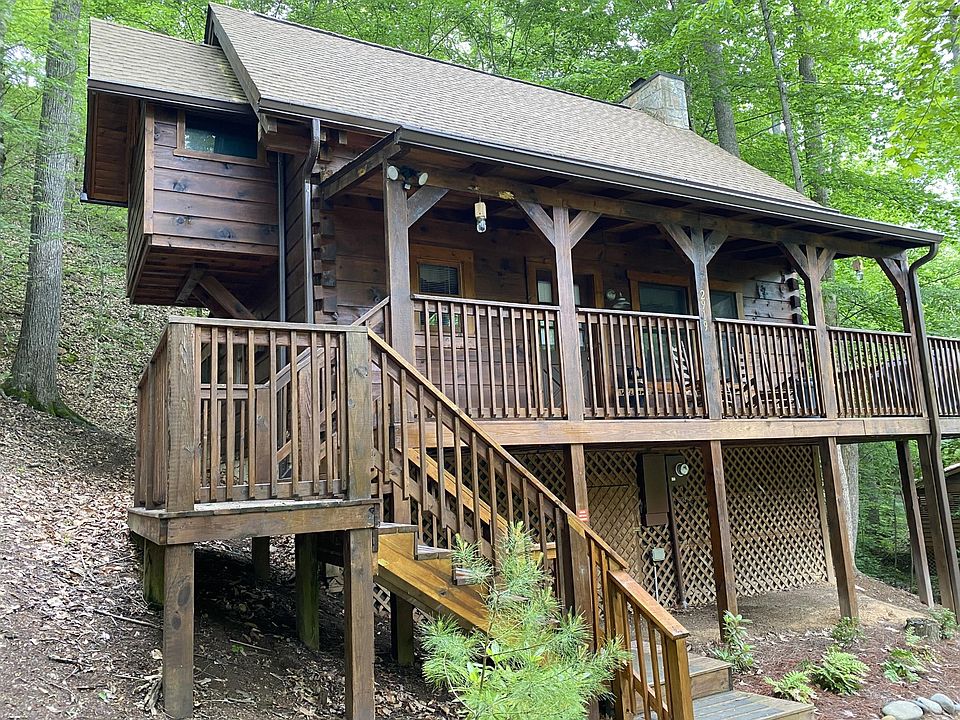 Fabulous, fully furnished log cabin in prestigious Eagles Ridge Resort. New HVAC, Newly built entry steps. Newly stained exterior. New roof. New smudge-proof kitchen appliances. New, high quality furniture. Updated faucets and fixtures. New crawlspace vapor barrier and insulation. Hot tub in screened-in room. Wrap around porch. Tons of privacy at end of Peregrine Way. Unique cabin design. Beautiful stacked stone gas fireplace. Windows everywhere with excellent views of nature and abundance of natural light. Excellent cash flow/income source or your full-time residence. Near Dollywood and all Pigeon Forge attractions and shopping. Minutes from Gatlinburg and the Great Smoky Mountains National Park.