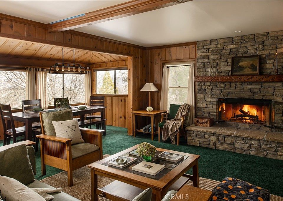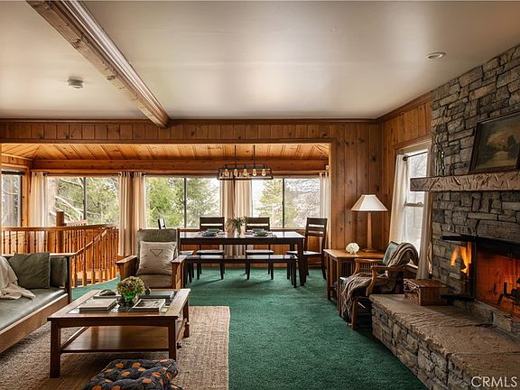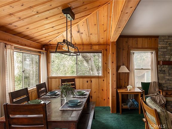 Perched above the trees and just moments from the towns of Lake Arrowhead and Cedar Glen, this level entry vintage gem with treetop and lake views is the perfect cozy retreat. Perfect for full-time living or part-time use, this home is also a successful short-term rental with an active Airbnb license—making it a turnkey investment opportunity. Elements of thoughtfully curated and elevated design details create a unique experience. Upon entry, an oversized mudroom with terracotta floors and wall-to-wall windows provides ease of use for every season and an abundance of storage. Through the charming kitchen with oak floors and an island is the open concept and spacious living area with a cozy wood burning stone fireplace, tongue and groove pine throughout and a charming window seat among custom built-ins. Enjoy meals in the dining space with a breathtaking wall of windows and views. The first guest bedroom is tucked away with wraparound windows creating a luxurious space with extra privacy. An additional bedroom and the sweet vintage bathroom complete the first level. A gorgeous hand-built solid wood spiral staircase is a work of art in this home. This alluring piece of craftsmanship leads you to the large primary bedroom with a bay window seat open to a private patio. The outdoor space is abundant with two separate seating areas and situated on a rare double lot, the expansive open space next to the home offers endless possibilities for expansion or customization. This turnkey offering provides peaceful mountain living near numerous hiking trails, the famous malt shop, Cedar Glen Inn, Mag. Pi, Cedar Glen Fine Foods grocery and much more!