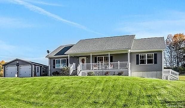 Outside, a covered front porch and rear deck provide elegant spaces to relax and entertain while enjoying serene vistas of the meticulously landscaped grounds—perfect for intimate gatherings or tranquil reflection amid nature’s beauty. Complementing the property is a detached two-car garage, ensuring ample space for vehicles and storage.