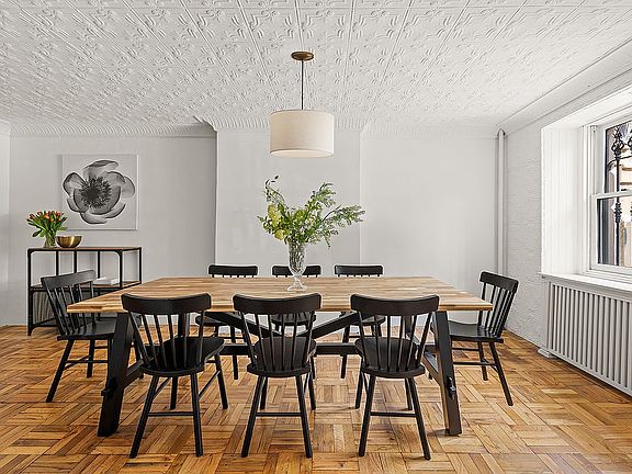 On the ground level is a spacious dining room that can fit a very large table for hosting guests, enriched by hardwood floors and an airy ceiling with intricate detailing. In the rear sits an eat-in kitchen with warm exposed brick, rustic wood beamed ceilings, and a door to the tranquil yard wrapped in wood fencing, with planting areas for the gardener and paver stones for alfresco living/dining. Also on this level is a half bath and several closets.