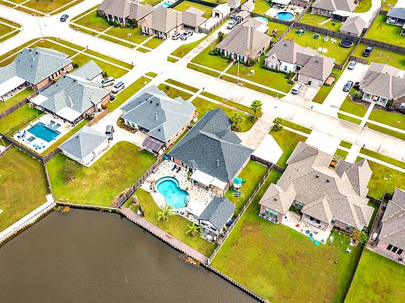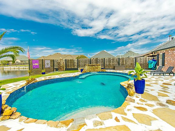 CUSTOM-BUILT BEAUTY ON THE POND IN WESTGATE SUBDIVISION! From the moment you arrive, you'll be greeted by the curb appeal of a beautifully landscaped front yard featuring three mature palm trees and an extended driveway offering plenty of parking. Step inside and fall in love with tall ceilings, elegant triple crown molding, and an open-concept layout. Custom built in 2008, this home features no carpet, generous bedrooms, and abundant storage throughout. The living room boasts a cozy wood-burning fireplace, while the kitchen offers granite countertops, custom cabinets, stainless steel appliances, and a stylish island with decorative pillars. The spacious primary bedroom features a tray ceiling and an en-suite bath with double vanities, a jetted soaking tub, separate shower, and two walk-in closets. The laundry room provides additional cabinetry and space for a home office setup. The attached garage is climate-controlled and includes a bonus room with its own HVAC (added in 2022), perfect for a 4th bedroom, office, gym, or playroom. Major updates include: new roof and gutters (2022), new HVAC system and all new ductwork with trunk line to ensure consistent airflow and optimal performance in every room (2022), and a new water heater (2025). Step outside to your private backyard retreat featuring five palm trees, a custom-built saltwater pool with slate surround, a covered patio, and a workshop with a roofed pergola for extra entertaining space. The property is bulk-headed on a stocked pond with an 80-ft composite walkway/dock built to last. Additional highlights include spray foam insulation in the attic and storm shutters for all windows. Located in Flood Zone X — no flood insurance required! Call your favorite REALTOR® today to set up your private showing!