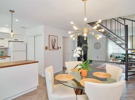 In a park setting with beautiful trees large green spaces in your front yard, with access to the community pool just steps away. The kitchen features newer cabinets, stainless steel appliances, opens to the dining space. This unit is three stories with a kitchen, laundry, 1/2 bath, and living room on the first floor. 2 Bedrooms, 2 Full bathrooms on the second floor, and a loft-style room at the top of a spiral staircase. Perfect combination of updates and class. Comes with a private fenced covered patio, storage shed, and two covered parking spots.