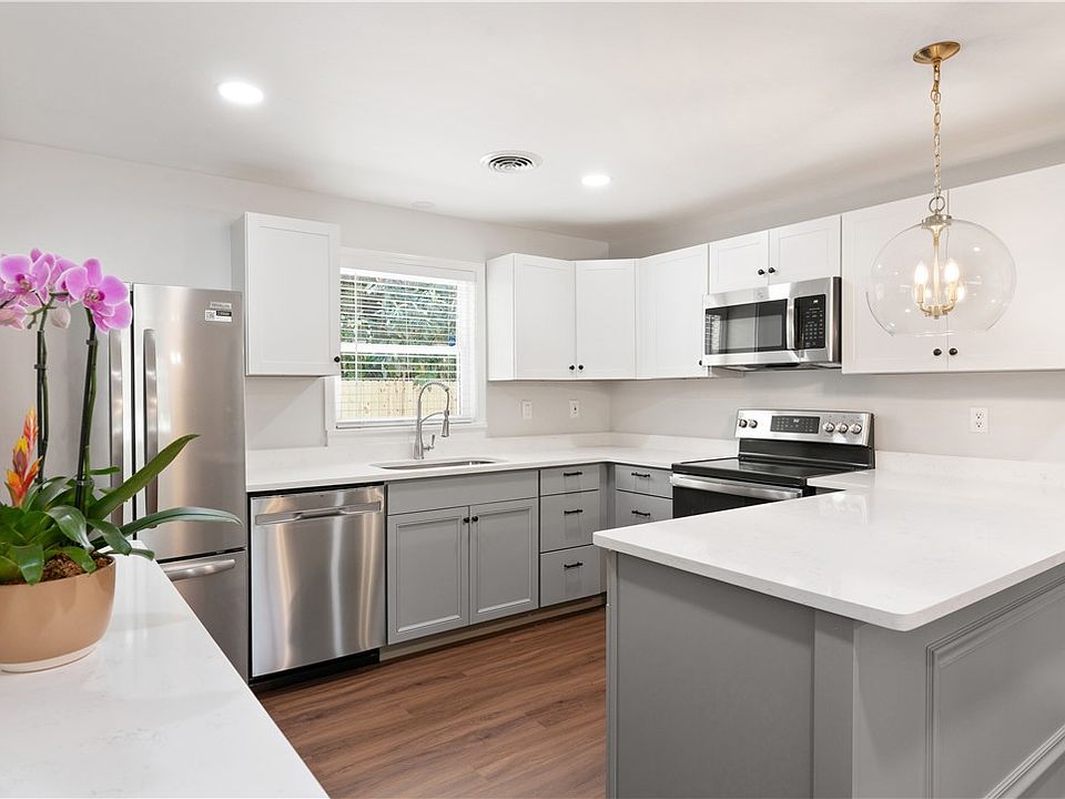 Fully renovated beautiful tabby home set on a corner lot in well established Eastview neighborhood..2 minutes to jump on the St. Simons causeway, 5 minutes to Downtown dining, shops, brewery, galleries, riverfront, etc. & only a minute to the college or hospital..what's not to love?! These quiet tree named streets of the neighborhood have long been a favorite of many locals but are quickly becoming a hotspot; as folks are appreciating the great location to all and the solid construction of the classic 60's ranch. The renovation was extensive & well executed; little touches such as moving a entry to the guest bathroom to allow for a larger vanity & foot print or pushing back an entrance to a bedroom or expanding the opening between the living room & kitchen for a more contemporary feel.. these are but a few of the thoughtful decisions that went into renovating this home. The "nearly new" metal roof is 2 years old, HVAC is 4 years old, water heater is 1 year old & the electrical panel is brand new. Both bathrooms have had a major overhaul with completely new plumbing, extension of the primary shower, all new subflooring, cabinetry, lighting, the works.. & boy they're stunning! Other items that were not overlooked include brand new closet doors throughout, new ceiling fans, new air vents and new smoke detectors, it truly is move in ready & hassle free. When the owners opened up the space between the living room & kitchen it really impacted the home in such positive ways; not only does it feel more modern & airy but it also allows you to consider hosting one of the holidays this year as you can now put those extra leaves in the table & extend out to your heart's desire. The kitchen boasts brand new everything; from the cabinetry (including a cool coffee or wine bar) to the appliances, to the continued new flooring throughout the home, to the gorgeous & gleaming quartz countertops. A wonderful family room off of the living room & kitchen expands your living & lounging space..plenty of room for a flatscreen and folks to sprawl. The family room is also home to the spacious laundry room as well as access to the back yard; making it easy for you to bring in the groceries if you park in the back. Outside there's a new privacy fence & plenty of room for you to put your stamp on the yard space & decide how you want to use it. Mature trees & landscaping with a coastal touch add to the lush, calming vibe this home puts out. Take the time to come see for yourself & make this home yours!