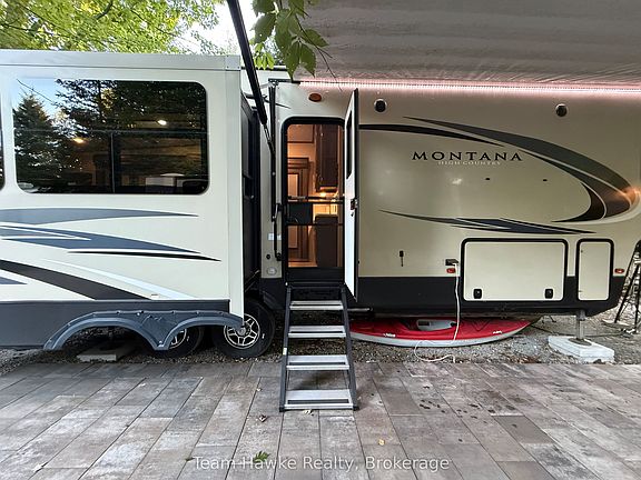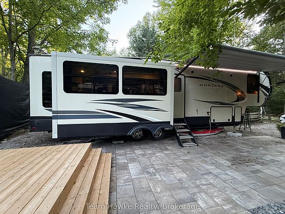 Experience the ultimate in comfort and style with this 2019 Keystone Montana High Country 330RL fifth wheel located within Camp Hideaway! Measuring 37'4" in length with three power slideouts, this unit offers a bright, open-concept design featuring a central kitchen island with double sink, theater seating, free standing dinette, fireplace, and a rear tri-fold sofa for additional sleeping capacity. The front bedroom provides a walk-around king bed, full wardrobe with washer hookup, and dresser storage. The bathroom is equipped with a large shower, vanity with double sinks, and storage. Built for extended stays, this model includes generous tank capacities (66-gallon fresh, 98-gallon grey, 49-gallon black) and dual 30 lb propane tanks. The seller has further enhanced the property with a modern stone patio and firepit area, a platform deck perfect for outdoor entertaining, and a fully insulated shed/bunkie with hydro. If you're seeking a seasonal getaway with dirt cheap fees, this setup delivers comfort, quality, and thoughtful upgrades. Orr Lake Park is also within walking distance and offers a large park and playground area, and water access.