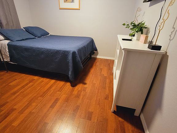 Furnished with bed, mattress, closet/dresser, 43" smart tv, walk in closet