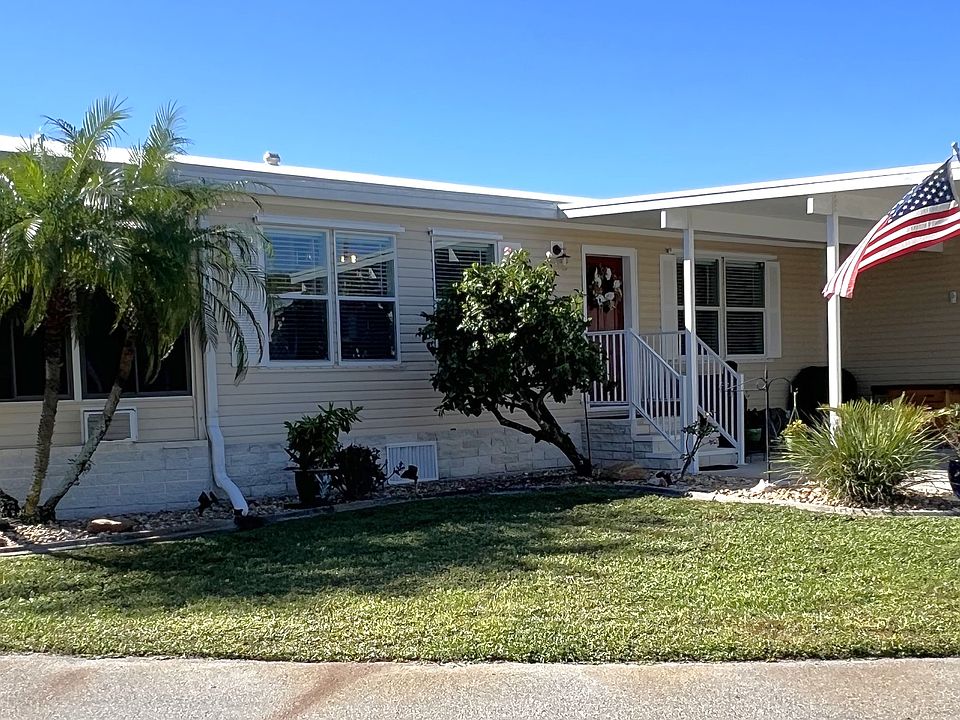 Welcome to this beautifully updated 2003 Merit home located in the highly desirable 55+ active community of Blue Heron Pines with an executive 18 hole golf course intertwined throughout the premises. This 3 bedrooms and 2 baths home offers 1,232 sf ft of comfortable living space and has been thoughtfully renovated for modern convenience and Florida living at its best. This home features an HVAC heat pump & AC (Jan 2018) for efficient and reliable comfort year-round, new kitchen appliances (Dec 2022), renovated kitchen, bathrooms and bedrooms (2022-2023) with stylish finishes and updated fixtures and new carpet in 2 bedrooms.In addition, there is new lighting throughout creating a welcoming atmosphere. The Florida room has adjustable window panels and pet resistant screens, perfect for relaxing or entertaining.Relax outdoors on an open patio with retractable awning allowing you to enjoy shade or sunshine at your leisure. There is a two-car wide driveway for convenience and a fenced dumpster area for added privacy.The exterior of the home has a membrane roof (2016) which is durable and low-maintenance. There are aluminum storm shutters and Bahama shutters on the primary bedroom windows for enhanced storm protection.The Community Center offers a fitness center, library, craft room, fully equipped kitchen, billiards room, and large central area for social events and activities. Blue Heron Pines has a heated swimming pool with sun deck, shuffle board, horse shoe play area, fenced dog park, fenced RV storage area and fishing lakes.