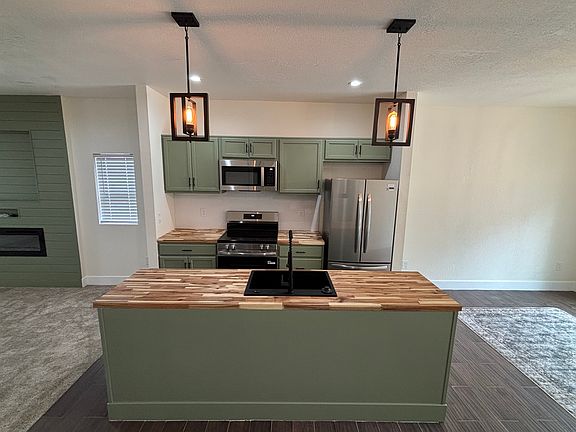 Carpeted family roomOne car garageOpen floor planSpacious bedroomsElectric fireplacePendulum lightsButcher block island