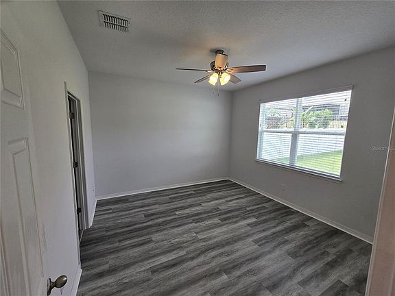 Discover this beautifully designed 3-bedroom, 2-bathroom home in the highly sought-after Lake Denham Estates. Boasting a spacious, open floor plan, the kitchen seamlessly overlooks the living and dining areas, making it perfect for gatherings and everyday living. Thoughtfully designed for privacy, this true split-bedroom layout places two bedrooms on one side of the home, separate from the primary suite. The primary bedroom features a luxurious en-suite bathroom, complete with double vanities, granite countertops, a private toilet room, a standalone shower, and a spacious walk-in closet. Enjoy stylish tile flooring throughout all living areas, complemented by new vinyl plank flooring in the bedrooms for added comfort. Each bedroom and the living room are equipped with blinds and ceiling fans for convenience and comfort. Step outside to a covered back patio and spacious backyard, offering the perfect space to unwind or entertain. The home also includes a two-car garage for ample parking and storage. Residents can take advantage of the walking distance to the community pool, adding to the appeal of this wonderful neighborhood. Call today to schedule yours.