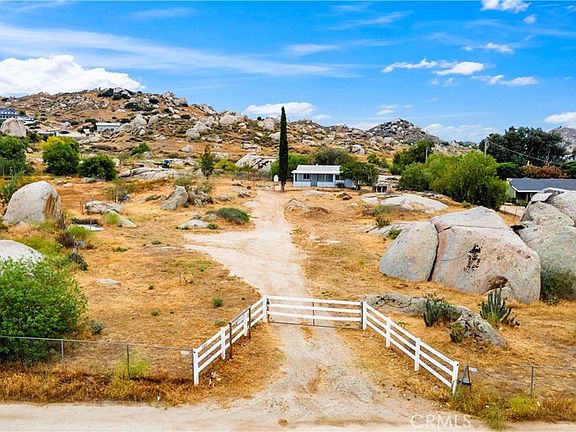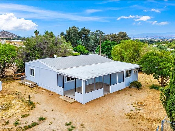 GREAT STARTER RANCH ON 2.07 ACRES! Bring the horses, animals & toys! Remodeled Manufactured Home on permanent foundation with SOLAR, NEW paint inside and out, laminate flooring, custom fixtures, new windows, ceiling fans throughout, granite counter + tile accented shower & custom cabinetry in bathroom & vaulted ceilings. This charming home offers 2 bedrooms + Bonus Room, 1 bathroom, indoor Laundry & large Family Room that opens to the Kitchen & Dining area. Also, features a covered, partially enclosed sunroom. Gated entry leads to a fully fenced & cross fenced 2.07 ACRE LOT with room for RV/ Boat/ Trailer Parking, Roundpen, Arena & Barn. This property has so much potential for a perfect RANCH SETUP! Located in a tranquil setting with views of the valley & mountains. Conveniently located near the 215 Freeway. NO H.O.A. and low taxes! Hurry, this one is priced to sell!