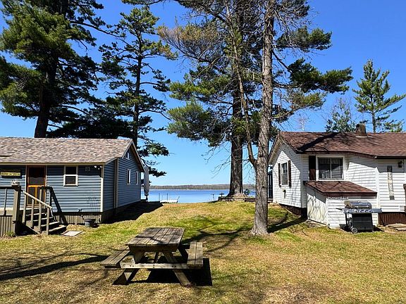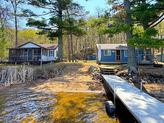 This Hickory Lake property is amazing, not 1, but 2 seasonal cabins, 120' of hard sand shoreline and a 1.92 acre lot! This is a kayaker's dream - grab your cooler and set out for a day of fun going from Hickory Lake to Spirit Lake or to Little Pine Lake and then into Farm Island Lake, so many options! The beautiful clear water on this great fishing lake is mesmerizing and the wildlife views abound. Each cabin has a living area, full kitchen with updated cabinets, 2 bedrooms and a 3/4 bath as well as large decks. The blue cabin, called Cedar Lodge, has an additional sleeping loft, and updates to the siding, windows and roof were made about 4 years ago. The white cabin, called Crooked Pine, has a screen porch and brand new roof on it and on the well house and white shed! There is a 24x24 detached garage with newer roof as well as sheds for additional storage. This property is being being sold "as is", mostly furnished/turn-key and also includes a dock and yard/maintenance implements. Bedroom/Bath count, foundation size and total square footage is for both cabins combined. Room dimensions listed as "Main Level" are for the 555 SF Blue cabin and the other room dimensions are for the 532 SF White cabin. Years built not found in public record and are estimated to be 1938. Cabins share well and septic. MLEC fiber optic internet is available.