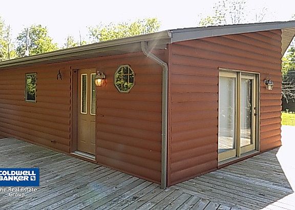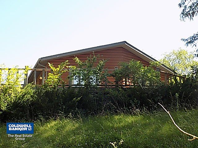 North bluff Log home sitting on its on private hill top on 2 acres +/-. Oak Kitchen with breakfast bar, Dining area, and Living room with 2 sets of sliding doors to wrap around deck. 2 bedrooms up and a full bath. Full basement partially finished with laundry, family room and 2nd bath. 30x58 metal building with concrete floors, overhead door, electric, & plumbing and wood burner. Property being sold "AS IS".