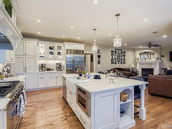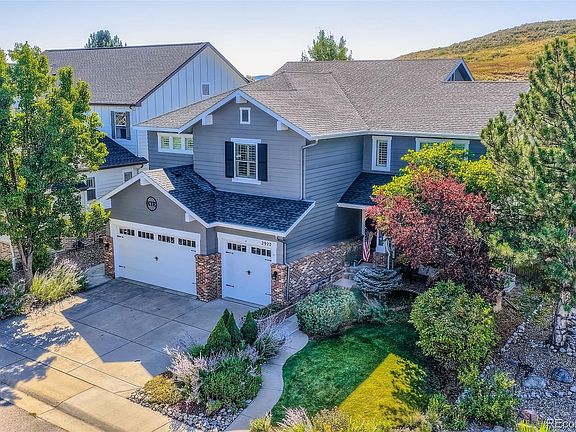 Perfectly positioned on a quiet cul-de-sac, this stunning home backs to hundreds of acres of protected open space with direct access to miles of scenic trails, offering a rare blend of privacy and outdoor adventure. A dramatic two-story foyer welcomes you inside, opening to a private main-floor office enclosed by French doors. The entry flows into the two-story living and dining rooms highlighted by the grand staircase. The recently renovated chef’s kitchen features professional-grade appliances, custom inset cabinetry, quartz countertops, and a designer backsplash. The adjacent family room is ideal for gatherings, with a cozy fireplace, custom woodwork, and breathtaking views. The main level also includes a spacious laundry/mudroom with storage and a convenient dog wash station, plus a custom-finished 3.5-car garage with epoxy flooring, cabinetry, and ceiling racks. A large office/bedroom with hide-a-bed and access to a ¾ bath provides flexible living options. Upstairs, the luxurious primary suite offers custom built-ins, a sitting area, and a private deck overlooking open space. The spa-inspired bath features a freestanding tub, oversized shower, custom cabinetry, and a walk-in closet. Three additional bedrooms include one with an ensuite bath and two sharing a Jack-and-Jill, all connected by a versatile loft. The finished basement offers incredible flexibility with a media room, wet bar, tiled wine cellar with custom racks, and a sixth bedroom with a nearby ¾ bath. The front and back yards are designed for low maintenance, leaving more time to relax in the hot tub or enjoy the outdoors. Energy efficiency is enhanced by the fully owned Tesla solar system installed in 2024. This exceptional property also provides access to four recreation centers and is within walking distance of elementary, middle, and high schools.