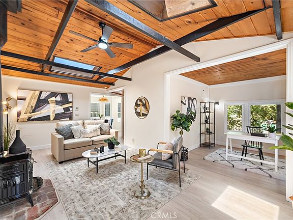 **PRICE JUST REDUCED FOR QUICK SALE ***Nestled along one of Silverado Canyon’s most coveted streets, this thoughtfully updated home offers a great mix of comfort, character, and usable outdoor space. Inside, you’ll find new luxury vinyl flooring, fresh interior paint, central heat and air. The living room is anchored by a cozy wood-burning stove, creating a warm and inviting spot to relax. The kitchen offers peaceful views of the backyard and plenty of storage for everyday needs. Adjacent to the kitchen is a bright, window-lined dining room. French doors open from the dining area to a lookout deck and the yard below, making it easy to enjoy the outdoors. Two secondary bedrooms are located to the left of the living room, connected by a Jack-and-Jill bathroom with shower, along with an open communal loft above. A spacious downstairs office/ bonus space leads to the upper level. Upstairs, a generous primary suite awaits, complete with a walk-in closet, full bathroom, and private balcony. Outside, the tiered backyard is designed for both relaxation and entertaining, with beautiful landscaping throughout, ample space to gather, and an expansive flat lower yard that looks out over scenic Silverado Creek. A detached shed within the yard adds even more possibilities- ideal for an art studio, workshop, or private office. Located in a vibrant neighborhood near the Cleveland National Forest, you’ll enjoy easy access to hiking and biking trails, horse facilities, local eateries, community activities and events, a nature preschool, Silverado Park + Community Center, award-winning schools, a community garden, and the Silverado Public Library. Come experience canyon living at its finest.