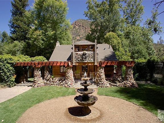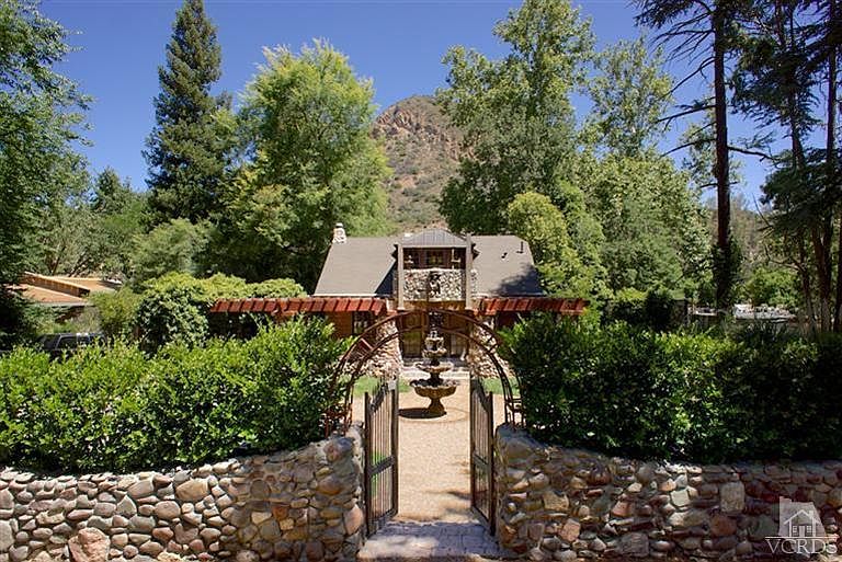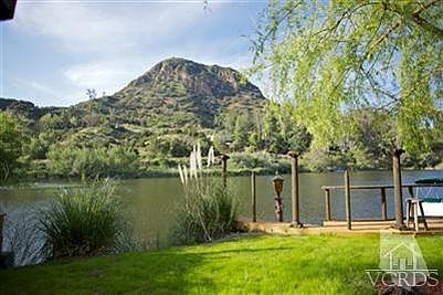 Charming stone fence & sparkling fountain lead to this grand & enchanting cottage, fronting picturesque rocky Santa Monica mountain scene & Malibou Lake,and from behind its prestigious secluded gates, this twice celebrity-owned home.(Hint: This home will bewitch you & you'll feel like being on the banks of where a river runs though it.)Home features spacious great room w/fireplace opening to view of lake; intimate dining room with intricate weathered iron work; built-in antiques & chandelier fxt; private mstr suite w/view & meditation balcony; covered & partially enclosed entertainer's patio & adjacent conversational area & fireplace; distressed antique-style carved crown mldgs,incl base & casings. 1 bdrm is media rm w/add'l cozy fireplace; basement encompasses most of base of home. Backyard faces lakeside & features 2 spacious covered cabanas; spa grotto w/waterfall; dock & detached storage shed. LVUSD