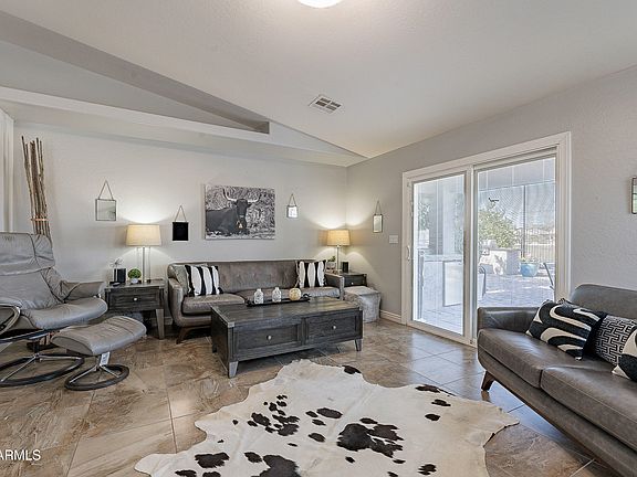 Imagine relaxing in your heated salt water pebble tec pool, soaking in those iconic Arizona sunsets right from your backyard. Located on the 6th tee box, this stunning home is built for entertaining complete with a built-in BBQ, gas fire pit, and plenty of seating. The low-maintenance yard features pavers throughout and an automated drip system to keep everything easy and efficient. Inside, you'll find a fully furnished, move-in ready home with three bedrooms, two bathrooms, and a versatile office or den with direct access to the backyard. The open floor plan creates a spacious, airy feel, and the living room has cozy electric fireplace. The kitchen shines with stainless steel appliances, an induction stove, granite sink, quartz countertops, custom backsplash, and a breakfast bar. The primary suite offers a cozy electric fireplace and a luxurious bathroom also with electric fireplace with a custom walk-in shower and a rainforest showerhead. Quartz countertops and soft close drawers. Laundry room comes complete with washer and dryer. Two car garage has plenty of storage with built in cabinets, man door and epoxy floors. Don't miss out on this beautiful home and schedule an appointment today.