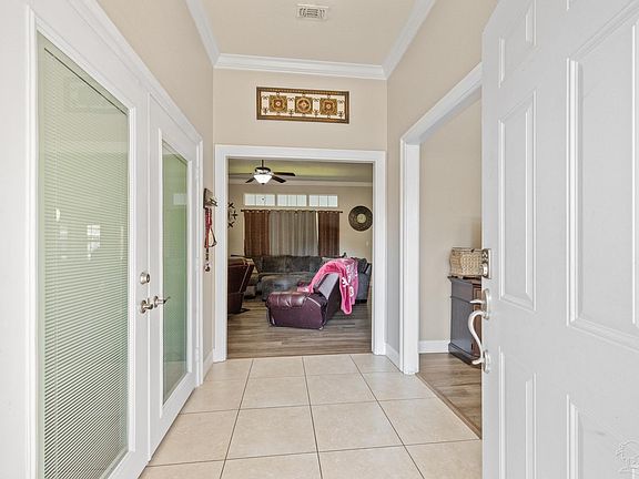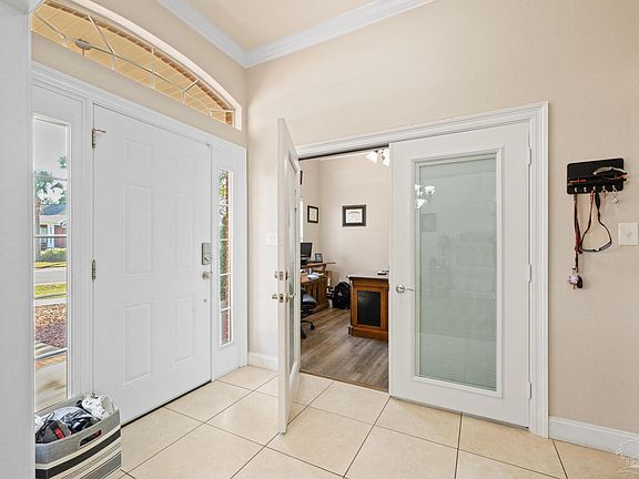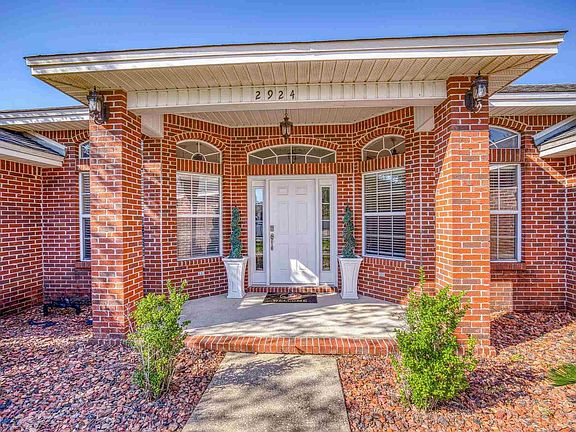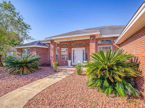 Welcome to this stunning brick home, nestled in the highly sought-after Crestview area. Boasting over 2,400 square feet of thoughtfully designed living space on a .25-acre lot, this home offers both style and functionality. As you arrive, you’ll be welcomed by beautifully manicured landscaping and a spacious, inviting front porch—perfect for relaxing afternoons. Inside, the light and neutral color palette creates a bright, airy atmosphere, complemented by elegant touches like crown molding throughout. The formal dining room is ideal for special gatherings, while the dedicated office space offers the perfect environment for work or study. The kitchen is designed with both practicality and style in mind, featuring a breakfast bar, eat-in dining area, and plenty of cabinet space for storage. The living room is a cozy, inviting space with a wood-burning fireplace at its heart, perfect for family gatherings or quiet nights in. The primary bedroom is a true retreat, featuring a tray ceiling, crown molding, and an en-suite bathroom designed for luxury. Enjoy a double vanity, a relaxing soaker tub, and a separate walk-in shower—perfect for unwinding at the end of the day. The additional bedrooms and bathrooms are well-designed, offering comfort and privacy for family or guests. Step outside to the large covered porch overlooking the backyard—a perfect space for outdoor entertaining or simply enjoying the serene surroundings. This home combines elegance, comfort, and functionality, offering the perfect setting for family living. Located just minutes from shopping and dining, 53 minutes to Downtown Pensacola, 32 minutes to Fort Walton Beach, and 22 minutes to Eglin AFB, this home provides the ideal balance of peaceful living with convenient access to everything you need.