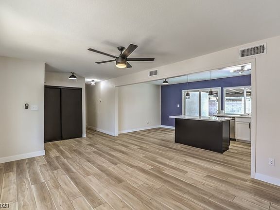 Newly remodeled, NO HOA, single-story, 3-bedroom home with fenced front yard, RV parking and spacious backyard with covered patio and shed! Located minutes from the entertainment, casinos, and shopping of Downtown Las Vegas! The home has beautiful interior finishes, painted accent walls, upgraded modern light fixtures, ceiling fans, mirrored closet doors, laminate wood flooring and plush carpet throughout! Customary kitchen with garden view, new white shaker cabinets & counter tops, stainless-steel appliances, gas stovetop and island. Bathrooms have been upgraded with modern tiled showers with built-in niche, new vanities with framed mirrors, hardware and lighting.