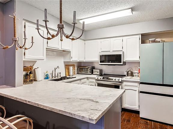 The open kitchen is adorned with bar stools, stainless steel appliances, and marble counter tops. Both bedrooms are spacious with walk in closets and en suite bathrooms. Newer roof.
