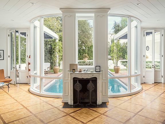 Designed by the celebrated John Elgin Woolf in 1939, this private and gated mid-century estate is the epitome of Hollywood Regency style. Situated on over half an acre in the Hollywood Hills, this fully furnished residence stands as an architectural marvel, featuring curved walls and glass throughout. An U-shaped pool area serves as a central feature, while the main house is accented by floor-to-ceiling windows. Extensively restored in the 1960s by Woolf himself, the two-bedroom, two-bath residence was expanded to include a chevron-patterned pool house. Additional notable features include ornate built-in bookcases, a formal dining room, and a primary suite with a perfectly placed bay window and an impressive ensuite bath. With Hollywood pedigree and ultimate privacy, this home is a timeless masterpiece. Tenant pays for all utilities and renter's insurance