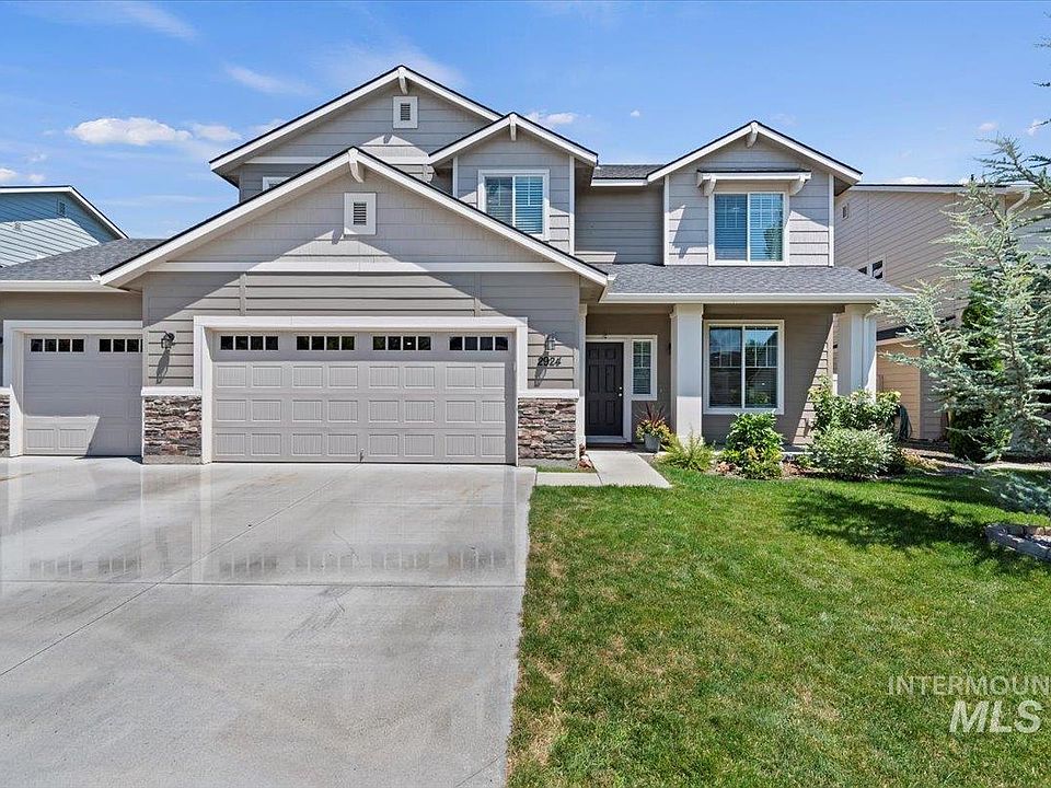 Immaculate one-owner home is ready for its next chapter. Offering 5 spacious bedrooms and a versatile main-level office with French doors, and a large closet. A 1/2 bath is conveniently located just across the hall. Upstairs, the large 5th bedroom doubles as a media or bonus room. The primary suite offers dual vanities & a generous walk-in closet with built-ins. Laundry is upstairs near bedrooms for ease of use and the secondary bath is equipped with dual vanities.The kitchen checks every box: granite countertops, island with breakfast bar, gas range, stainless steel appliances, soft-close cabinets, pantry, large dining space and durable LVP flooring. The main living area is well-planned for modern living.Enjoy a 4-car garage with rear door to the yard, new pavers, & an 8x16 storage shed. Backyard features covered patio, grass & space to garden. HOA includes 30mgbs fiber optic internet & pressurized irrigation & community pool. Ideal location near Settlers Park, I-84, restaurants, shopping & entertainment!