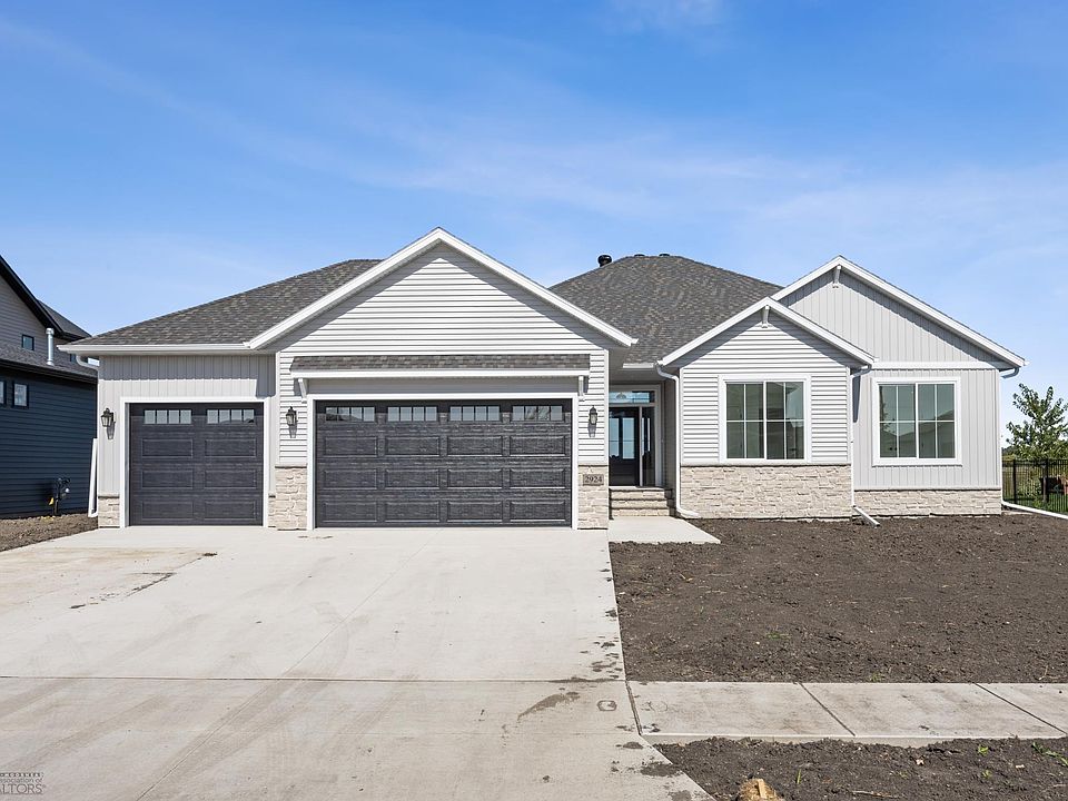 Extras include a fully heated garage (taped, textured, and painted), Costco door, service door with exterior pad, laundry and mudroom cabinetry, open railing, and sprinkler system rough-in. Curb appeal shines with a Hebron brick address stone.