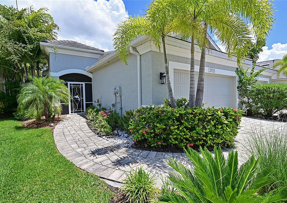 Welcome home to your sunny Sarasota home built by Award winning Medallion Homes! Just 6 years young and in pristine condition as the current owner uses as a Second home. This adorable model is called the LIDO and was built with a GOLD Series package that includes stainless steel appliances, 42" raised panel wood cabinets, tumbled stone backsplash, and Corian countertops. The spacious and open floorplan has 2 bedrooms, 2 baths and a flex room that could also be used as an office or a den or dining room and surround sound in the Living room ceiling. Both the front porch and the back lanai are screened and enclosed perfect for Florida living. All rooms are tiled with 18X18 inch porcelain tile except the Primary bedroom which has carpet, 1K CARPET ALLOWANCE. The primary suite is large and has two walk-in closets. The spacious primary bathroom has a nice sized shower and dual sinks, along with a linen closet. All University Village villas have 2 car garages, tile roofs, and brick paver driveways, paver sidewalks, along with paver walkways that lead to your front door. University Village is so affordable with low HOA fees and NO CDDs. Standard HD cable, internet, and exterior water and all yard maintenance is included with your homeowner fees. This 24-7 gated community is pet friendly with a nice sized dog park. There is also a heated community pool, hot tub, grilling area and Clubhouse with kitchen. Adjacent to the community will be a new Manatee County recreational park which will include walking trails, pickle ball and yet another dog park. Positioned near the University Corridor of Sarasota this location is so convenient to shopping at University Mall, the many award winning beaches, and nearby I 75. Furniture under a separate agreement.