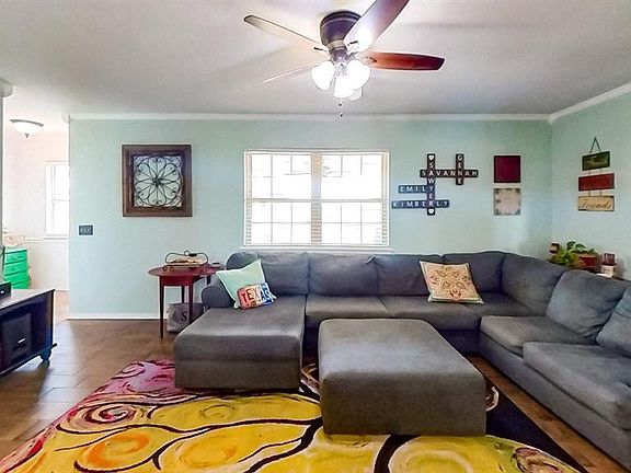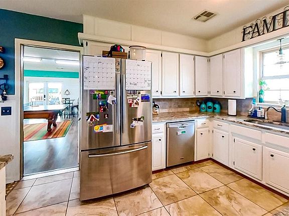 Large living room opens to a formal dining or office/den. Oversized tile throughout except for game room. Has some crown molding & cheerful colors. Kitchen is roomy, has dining area with white wainscoting, stainless steel appliances, dishwasher & smooth top elec. cook stove, granite counters, bar, breakfast area. Bathrooms are both remodeled with tile & new fixtures in 2021. Off kitchen is a large game room/work-out room or den with laminate wood floors, great for coming in from pool.