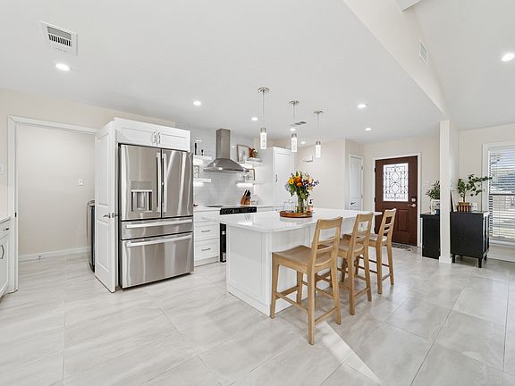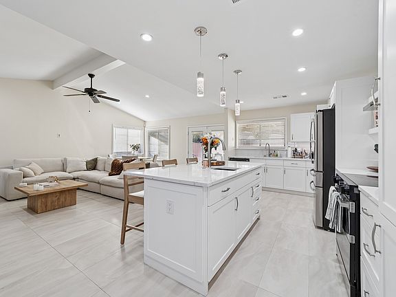 Step inside to discover a bright, airy living area with new tile flooring, fresh paint, LED lighting, and a reimagined fireplace surround that creates a warm yet contemporary feel. The kitchen is the centerpiece of the home, boasting custom cabinetry, granite countertops, a spacious island with built in vegetable sink, double oven, vent hood, and designer pendant lights. The open-concept layout flows seamlessly into the dining space perfect for entertaining or family gatherings.