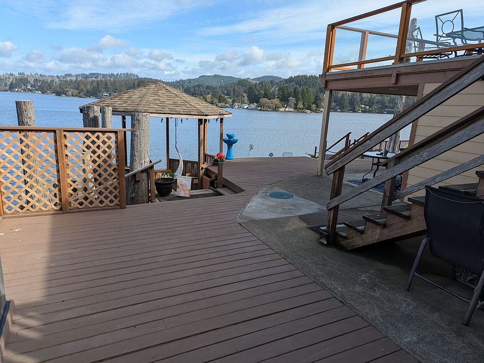 Lower level of lakefront two story with extended frontroom. This unique apartment was completely remodeled in 2024 with new kitchen bathrooms drywall flooring and plumbing. Includes oversized garage. Lakeside yard with large deck/patio, gazebo, hot tub and dock.
