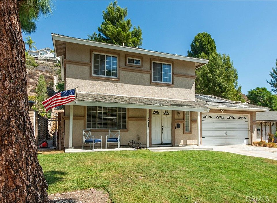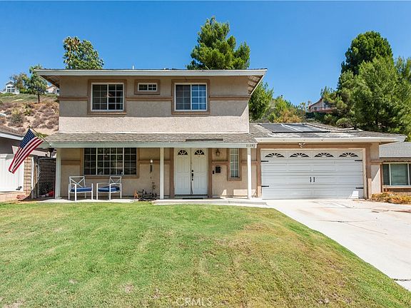 Welcome to this 4 bedroom, 2.5 bathroom pool home nestled on a generously sized lot in a tranquil, established Canyon Country community. A charming porch and expansive front lawn welcome you to the property, leading into a bright living room adorned with picture windows that fill the space with natural light. The kitchen features a stainless steel range, a dining area, and picturesque views of the backyard. Adjacent, a cozy family room with a fireplace offers a warm gathering space, complemented by a convenient powder room on the main level. Upstairs, the primary bedroom boasts a walk-in closet and a private bathroom with a shower, while three additional bedrooms share a full bathroom with a shower/tub combo. The backyard is complete with a sparkling re-plastered swimming pool and an aluminum covered patio—perfect for relaxing or entertaining. An attached two car garage with direct access to the home features a dedicated laundry area. Additional highlights include an oversized driveway, solar panels, PEX plumbing re-pipe, recessed lighting, laminate flooring throughout most of the downstairs, and ceiling fans. Enjoy the nearby local park, easy freeway access, and close proximity to the new Sand Canyon Plaza. No HOA or Mello Roos!