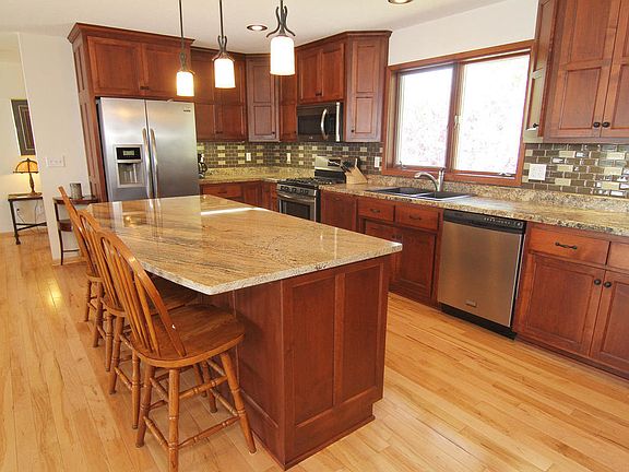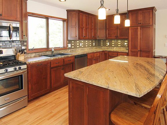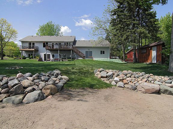 FABULOUS UPDATED LAKE HOME ON SOUTH CENTER LAKE ON .5 ACRE LOT! OFFERING MAGNIFICENT PANORAMIC VIEWS, APPROX 100 FT OF SANDY SHORELINE! FEATURES OPEN FLOOR PLAN, GORGEOUS KITCHEN W/CUSTOM CABINETS , TILE BACK SPLASH, CENTER ISLAND W/GRANITE COUNTER TOP, HARDWOOD FLOORS, RECESSED LIGHTING, AND MASTER SUITE W/PRIVATE BALCONY, FULL BATH, & WALK-IN CLOSET! PLUS, WALKOUT LOWER LEVEL W/FAM RM, GAS FPLC, KITCHENETTE, 2 MORE BR'S & FULL BATH, DEEP ATTACHED 3 CAR GAR, NEW ROOF, SHED & ANDERSEN WINDOWS!