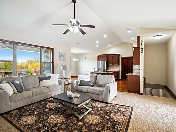 Better than new! This newer ranch style home is packed with amenities. From the moment you step foot inside the front door you'll discover the quality upgrades found throughout. The vaulted main floor family room opens to the gourmet kitchen and dining area making entertaining a breeze. The kitchen features granite countertops, beautiful cabinetry, a tiled backsplash, gorgeous hardwood flooring, and a huge walk-in pantry. The spacious dining area provides access to the rear covered patio making it easy to enjoy the beautiful surroundings. The main floor also features three bedrooms and two bathrooms including the great primary suite. The primary bedroom showcases specialty ceilings and an awesome bathroom that provides a dual vanity, a separate tub and a tiled shower as well as a walk-in closet. The lower level features even more living space with a large rec room and an awesome wet bar with a full sized refrigerator. The lower level also offers a fourth bedroom and a bathroom. Other amenities include a sound system, central vac, a security system, a main floor laundry room and a mudroom/drop zone area. You'll also love the oversized, attached, three stall garage! Act quickly, this one won't last long!