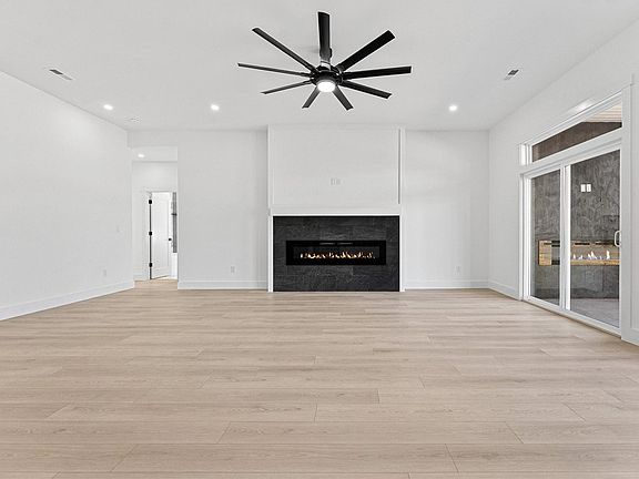 Your living room showcases elegant custom accent walls that bring warmth, texture, and a designer’s touch to your every gathering space. With its open flow, this spacious layout features a statement fireplace and three large sliding glass doors that extend to your covered patio complete with an outdoor electric fireplace as well — perfect for effortless entertaining.